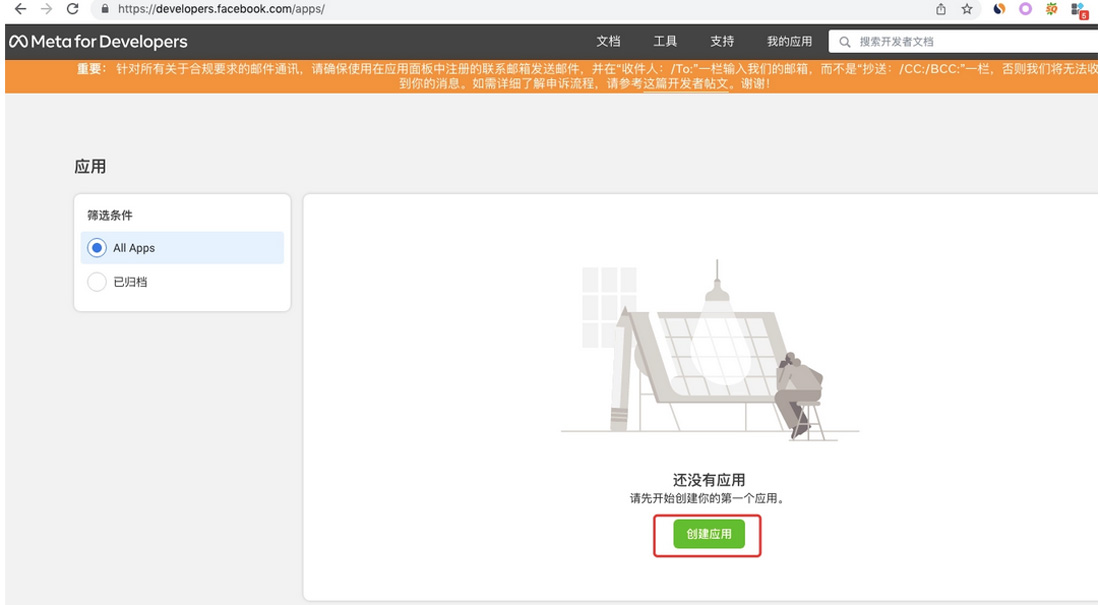 登錄后,我們會看到右上角有一個“我的應用”按鈕,點擊它并選擇“創(chuàng)建應用”(請看下圖)
