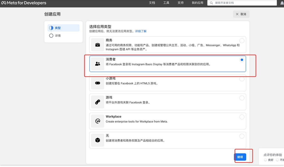 在應用類型中,我們選擇“消費者”,然后點擊“繼續(xù)”(請看下圖)