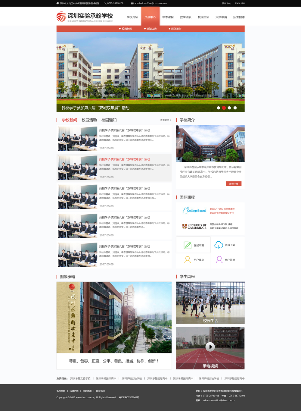 國際課程實驗校區(qū)(簡稱“承翰國際CICEC”)是經(jīng)深圳市政府批準(【2011】588)開展高中國際課程實驗的高品質(zhì)國際化學(xué)校。學(xué)校建筑獲得“魯班獎”,校園環(huán)境優(yōu)美高雅,國際化氛圍濃厚,場館設(shè)備齊全,硬件設(shè)施國內(nèi)一流,為學(xué)生營造安全、舒適、健康、科學(xué)的校園生活環(huán)境;學(xué)校由資深的中、外方校長合作管理,教師團隊由外籍教師和留學(xué)歸國的碩士、博士組成,因材施教,分層教學(xué),導(dǎo)入美國WASC認證體系,辦學(xué)成果顯著,助力眾多學(xué)子實現(xiàn)留學(xué)理想。