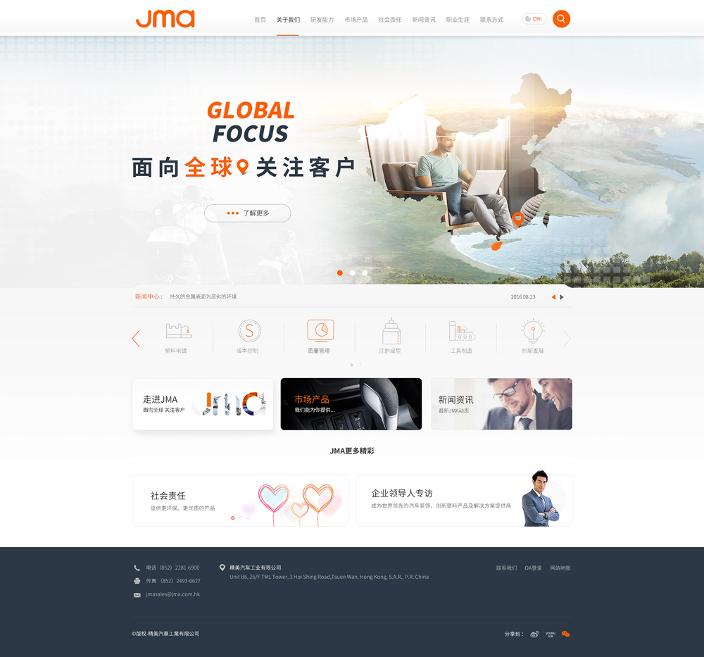 伴隨著汽車市場的前進(jìn)發(fā)展腳步,JMA團(tuán)隊(duì)走過了二十年的創(chuàng)業(yè)拼搏歷程,在全球汽車零部件行業(yè)內(nèi),成為汽車廠商的首選供應(yīng)商。至今,JMA累計(jì)產(chǎn)銷各類汽車門把手3億多件、外飾7千多萬件,產(chǎn)品遠(yuǎn)銷至歐、美、日本。在鞏固和發(fā)展國際市場的同時,不斷開拓國內(nèi)市場,逐步建立起全球營銷和生產(chǎn)體系。