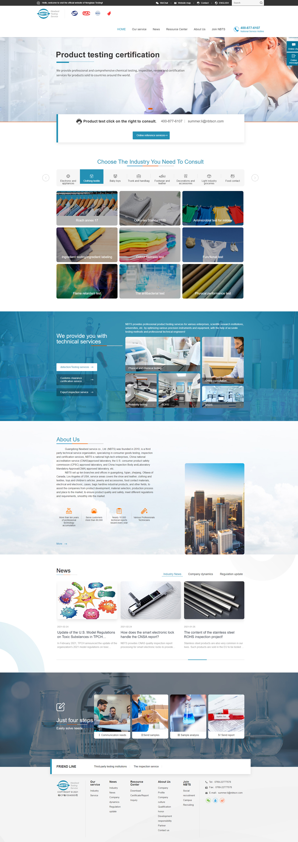 NBTS在廣東、福建、浙江、加拿大渥太華、美國(guó)洛杉磯等10個(gè)地區(qū)設(shè)立分公司及辦事處,服務(wù)領(lǐng)域涵蓋了鞋類(lèi)與皮革、服裝及紡織品、玩具及兒童用品、飾品及配飾、食品接觸材料、電子電氣、箱包、輕工產(chǎn)品等領(lǐng)域,協(xié)助企業(yè)從產(chǎn)品研發(fā)、材料挑選、生產(chǎn)流程到出貨進(jìn)入市場(chǎng)各個(gè)環(huán)節(jié)提供服務(wù),確保產(chǎn)品的質(zhì)量與安 全,滿足不同的法規(guī)及要求,順利進(jìn)入市場(chǎng)。