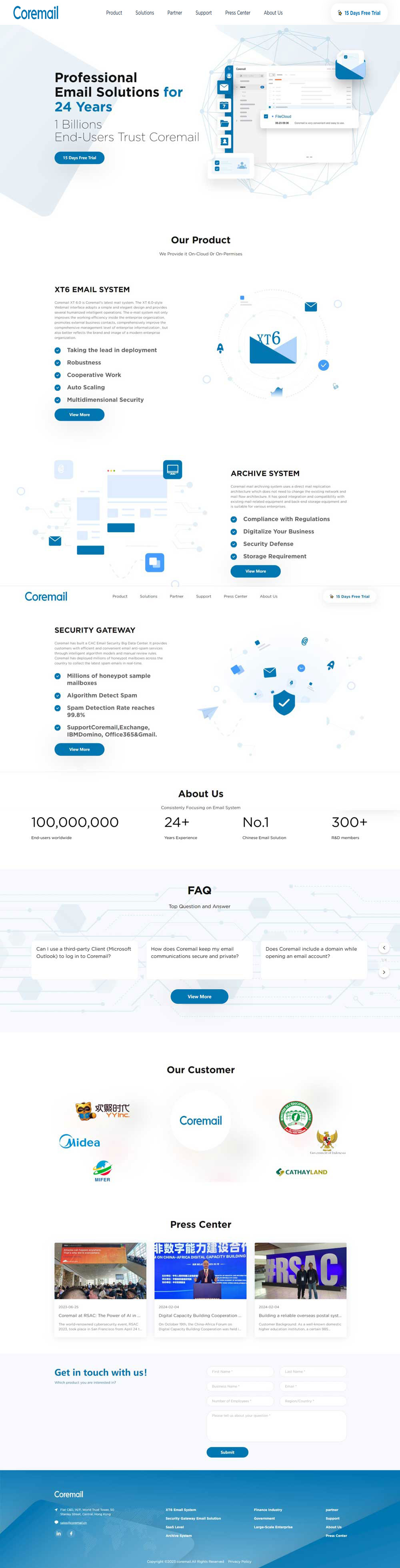 Coremail Hongkong Company Limited(香港訊捷有限公司)是中國(guó)領(lǐng)先的電子郵件解決方案服務(wù)提供商。Coremail品牌創(chuàng)立于1999年,2007年由網(wǎng)易戰(zhàn)略投資。公司總部位于廣州,在北京擁有近300名技術(shù)與服務(wù)團(tuán)隊(duì),上海、深圳、廈門、重慶、武漢等地。Coremail專注于企業(yè) 郵箱24年,郵箱技術(shù)領(lǐng)先,擁有超過10億終端用戶。我們?yōu)檎?、教育、金融等提供郵件系統(tǒng)相關(guān)產(chǎn)品和解決方案行業(yè),以及各種企事業(yè)單位。