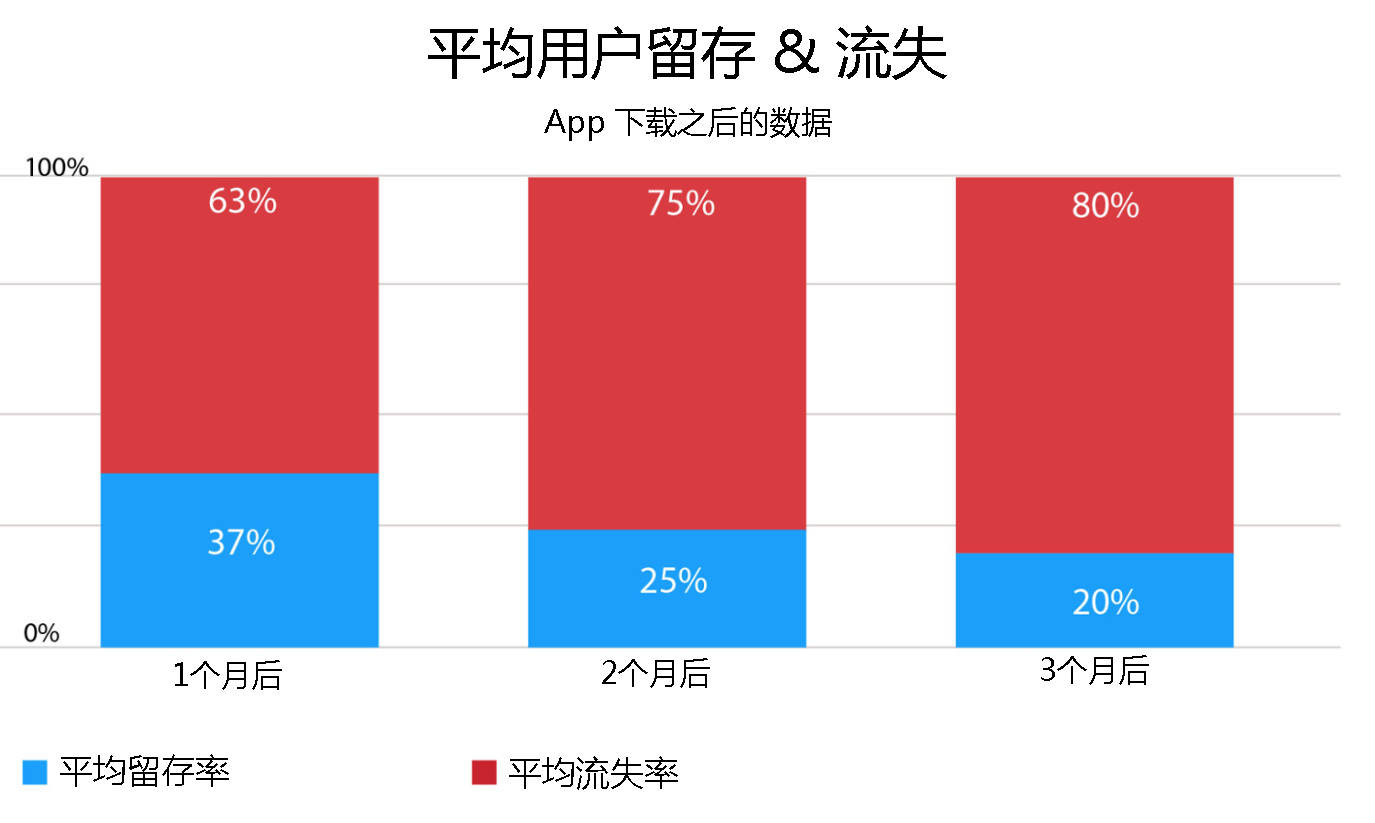根據(jù) ASO+ 數(shù)據(jù)顯示,一個(gè) App 三個(gè)月以后的用戶流失率高達(dá) 80%。下圖的數(shù)據(jù)告訴我們,提高用戶留存迫在眉睫。